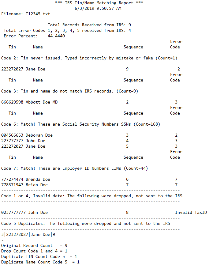 This report gives you the IRS error codes and whether the number does or does not match the name submitted. The IRS will NOT give you the corrected information. At this point you must contact the individual or company and request a corrected W9.